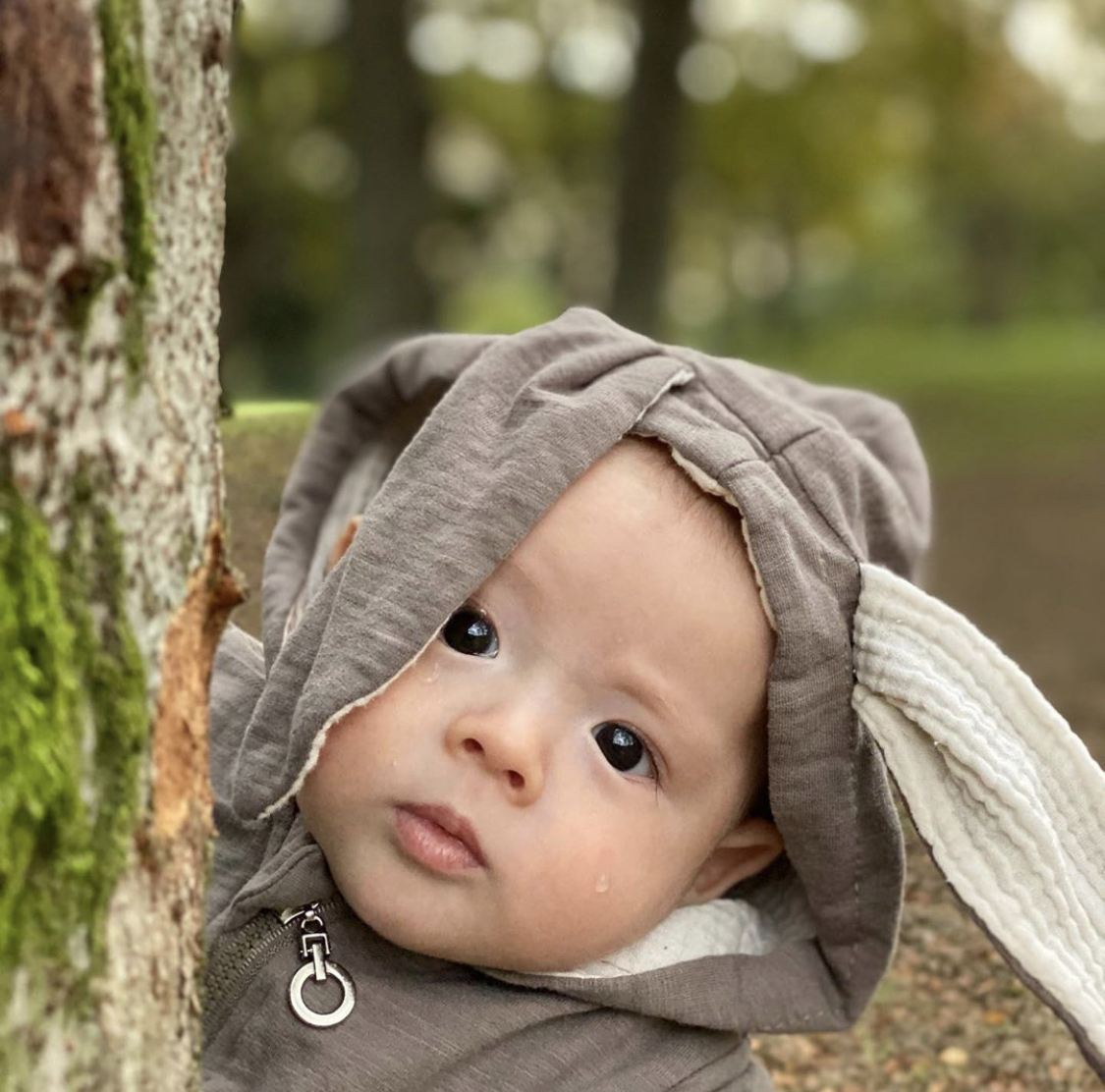 グレーのラビットロンパース